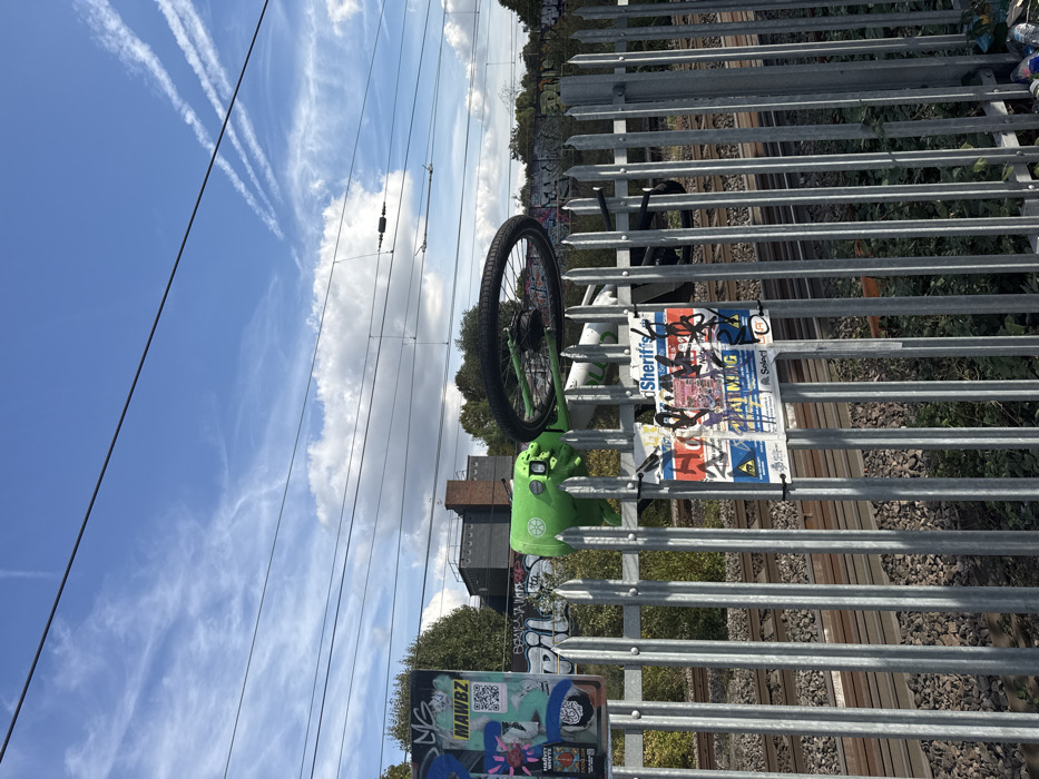 This image depicts a railway line within the city of London, United Kingdom, viewed from an elevated perspective over a security fence. In the foreground, a tall, galvanized steel palisade fence with pointed vertical pales runs horizontally across the lower portion of the frame. Attached to the left section of this fence is a vertical panel or sign, heavily covered in multi-colored graffiti art and stickers, including text reading "MAWBZ" and a visible QR code. Further to the right on the same fence, a landscape-oriented paper poster, possibly a public notice, is heavily defaced with black marker graffiti, partially obscuring the legible text "Sheriff's" and "MATMAG". Resting on top of the fence, an overturned green bicycle is visible, with its rear wheel prominently elevated and pointing towards the upper right. A distinct, luminous green plastic object, possibly a toy or accessory, is attached near the bicycle's frame. Behind the fence, multiple parallel railway tracks are visible, laid on a bed of ballast. Beyond the tracks, to the left, a grey industrial-style building with a red-brick chimney stack stands, its walls also covered in graffiti. Dense green foliage and trees line the railway tracks and recede into the background. The sky overhead is bright blue with scattered white cumulus clouds and multiple white aircraft contrails. Numerous overhead railway electrification lines are visible, spanning horizontally across the sky. No individuals are present in the scene.