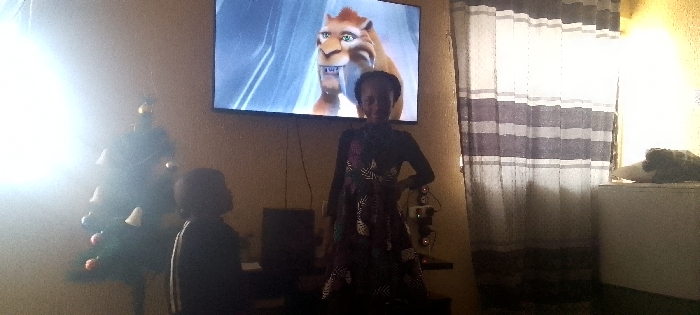 An indoor room within an unknown private residence in Unknown, Unknown, is depicted. A wall-mounted flat-screen television dominates the upper center, displaying an animated saber-toothed tiger character with prominent fangs and an orange coat against a blue and white striped background. Below and slightly to the right of the television, a taller individual, appearing to be an adult female or older child, stands facing the camera with a slight smile. She wears a dark, long-sleeved top and a patterned dress featuring a dark background with lighter, colorful abstract or leaf-like designs; her right hand rests on her hip. To the left, a shorter individual, a young child, is mostly in silhouette, facing right. They wear a dark top with lighter stripes on the arm. To the left of this child stands a decorated Christmas tree with baubles and white bells, partially obscured by a very bright light source, causing lens flare and overexposure in that area. The room features light-colored walls. On the far right, a window is covered by curtains with horizontal white and dark gray/blue stripes, with a light-colored rectangular object, possibly furniture, positioned below the window and a dark folded item on its surface. A wall-mounted power strip with multiple plugs is visible on the wall to the right of the taller individual. A dark rectangular object is present on a surface below the television.