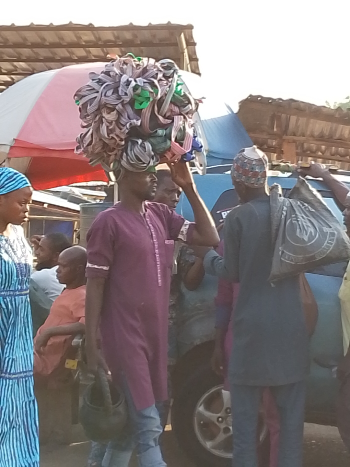 A man balances a large bundle of multicolored fabric strips on his head, holding it steady with his right hand. He wears a maroon tunic with light-colored cuffs and blue jeans, carrying a dark object in his left hand. He is surrounded by other people, some wearing traditional clothing, in what appears to be an outdoor market or street scene. A light blue car and a large umbrella are visible in the background.