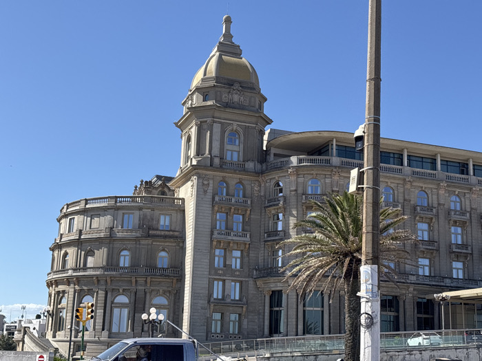 A grand, old building with a golden domed tower dominates the scene. It features ornate architectural details like balconies and arched windows. A palm tree and a utility pole stand in front, partially obscuring the view. A traffic light is visible to the left. The sky is clear and blue. A car drives by in the lower part of the image.