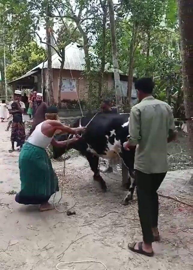 - "In a dirt area surrounded by trees and with buildings in the background, four men are attempting to tie down a black and white cow" by FM-xENTm1, licensed under CC BY 4.0
