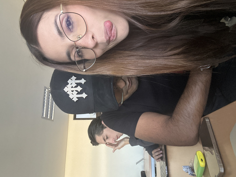 The image captures an indoor scene featuring three individuals, likely within a classroom or office setting in Zibatá, Mexico. In the immediate foreground, a woman with long brown hair and gold-framed glasses is taking a selfie, looking directly at the camera with her tongue partially extended. To her left, a man wearing a black baseball cap with three sparkling silver cross-like emblems and sunglasses is positioned with his head bowed, looking downwards. His right forearm is visible, resting on a light-colored desk. On the desk in front of him, a silver-colored smartphone, a bright green and yellow vape device, and a crumpled wrapper are present. In the background, to the left, another man with dark hair styled back is seated at a similar desk, facing towards the left. His right hand is near his temple, and an open laptop or tablet is visible on the desk in front of him. The environment includes light-colored walls and rectangular fluorescent ceiling lights.