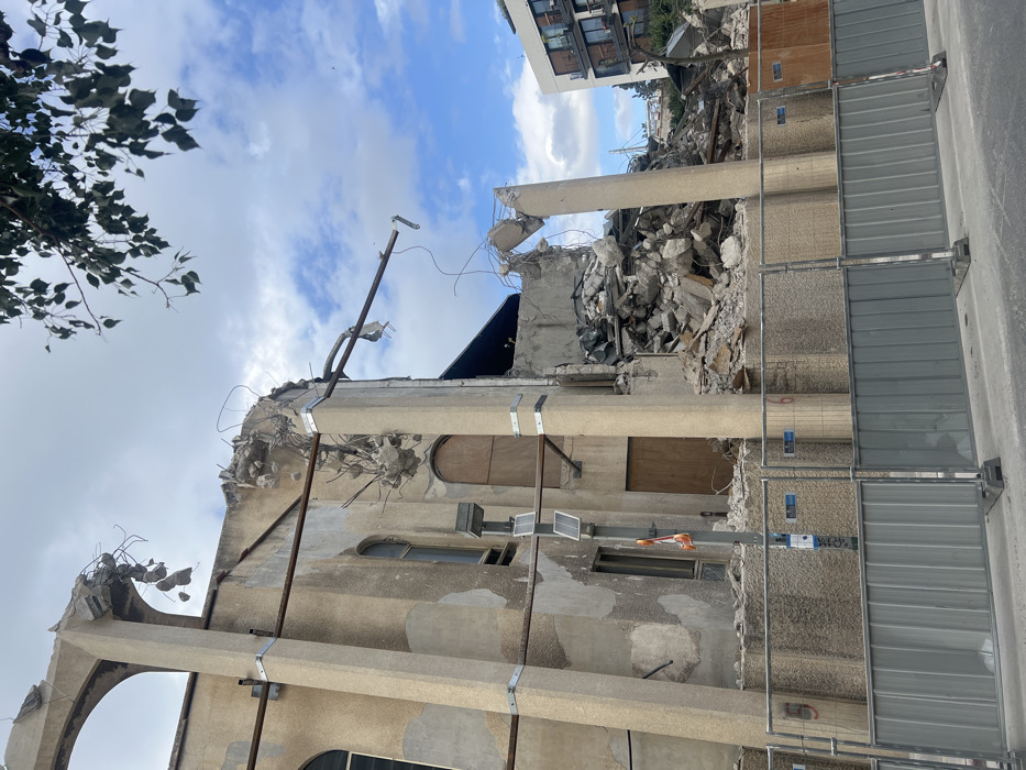 The image displays a multi-story building in Tel Aviv, Israel, undergoing partial demolition