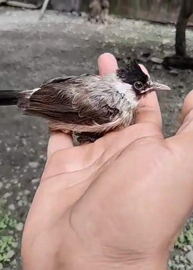 A medium close-up shot shows a person's hand holding a small bird. The bird is mostly brown and white with a black head and a small crest on top of its head. The bird's tail is black and long. The person is holding the bird gently in their palm. The background is out of focus but appears to be a yard with gravel and some trees.