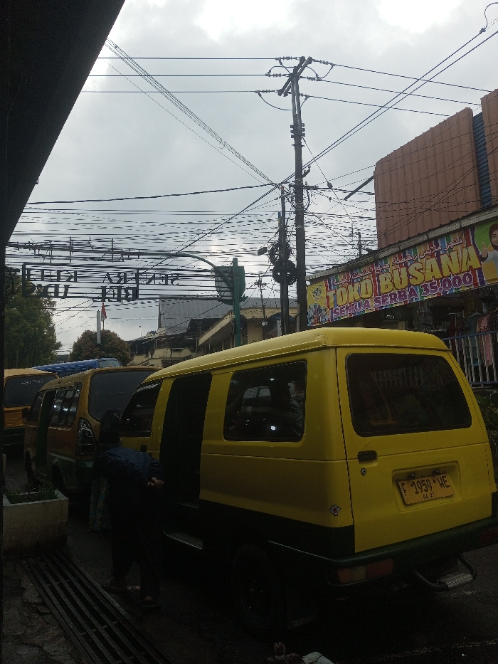 A street scene is depicted under an overcast sky, featuring a queue of yellow and dark-colored minivans parked parallel to a sidewalk. In the immediate foreground, a yellow minivan with a dark lower section has its side passenger door open. Its rear license plate, "F 1950 HE," is visible. A person, largely silhouetted in dark clothing, stands next to the open door of this vehicle, facing away from the camera. Behind the leading minivan, at least two other similar minivans are parked in line, also with open side doors. The background reveals a dense network of black electrical and communication wires crisscrossing the frame, supported by a prominent dark utility pole positioned slightly right of center. To the right, a building facade features a large, colorful banner that reads "TOKO BUSANA" (Clothing Store) in Indonesian, with additional text "SEMUA SERBA 35.000" (Everything 35,000) and some Arabic script. A cartoon character is depicted on the right side of this banner. Other buildings with varying rooflines are visible further in the background. A section of a tree with green foliage is present on the far left. The ground is dark, possibly paved, with a metal grate visible in the lower left foreground. Based on the Indonesian language on the commercial banner and the format of the license plate (prefix "F"), the scene is located in Indonesia. The image does not depict the city of Tangsibi, Bhutan.