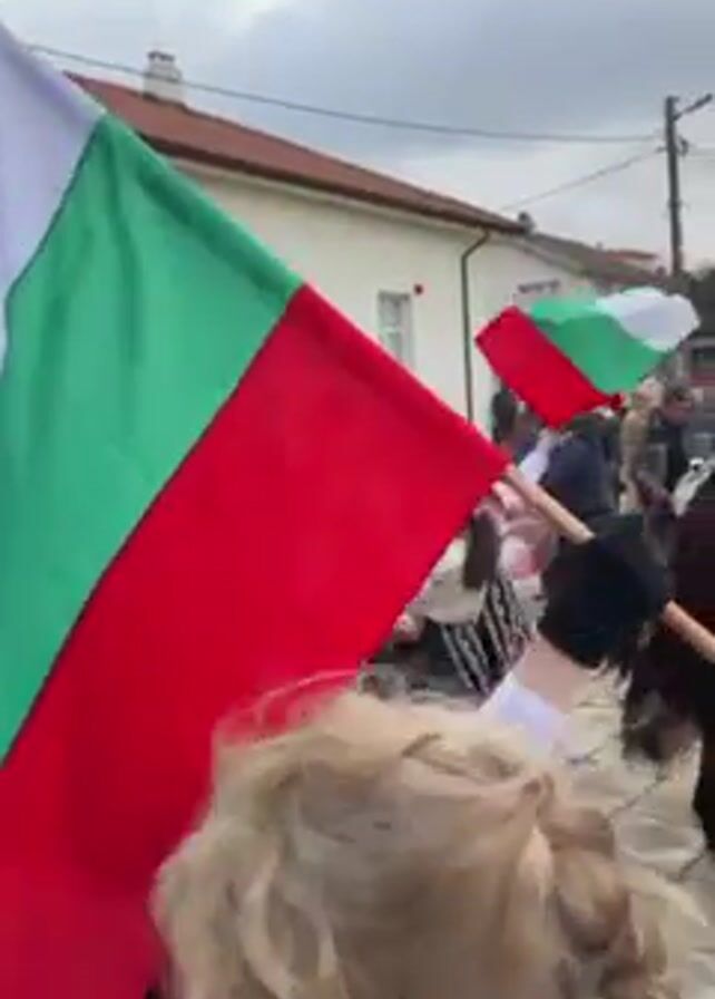 crowd of people gathered in an outdoor setting, likely a town square. Many individuals are dressed in traditional Bulgarian folk costumes, including ornate vests and skirts. Some wear elaborate masks with animal-like features and headdresses. A woman in the foreground holds a large Bulgarian flag, waving it as she moves through the crowd. Other flags are visible throughout the group. There are buildings surrounding the square, with light-colored walls and brown roofs. The sky is overcast. The overall atmosphere suggests a festive or celebratory event related to Bulgarian culture and tradition.