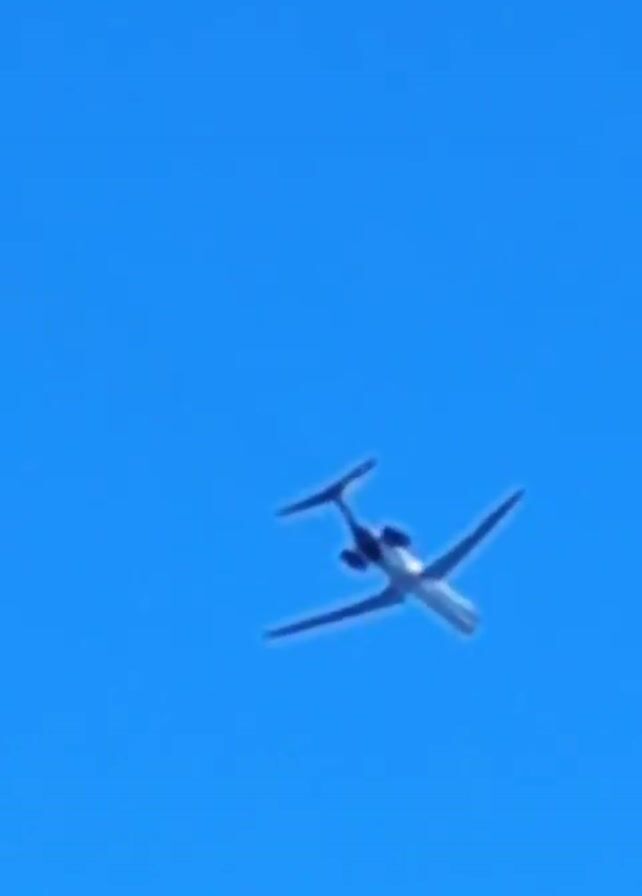 n airplane flying against a clear blue sky. The airplane is far away, so it appears as a small, white shape with a distinct tail configuration. The camera is stationary, and the plane appears to be moving away from the viewer.