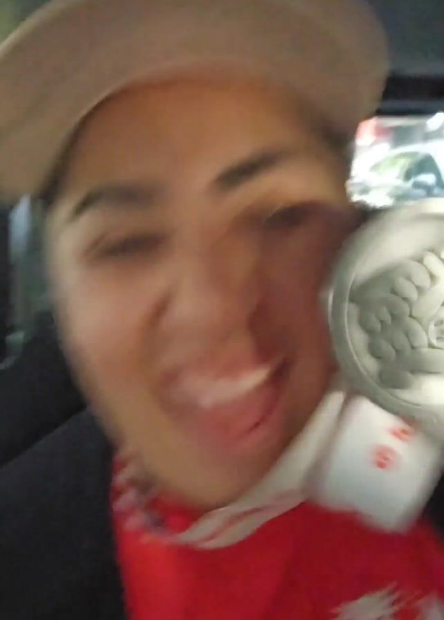 A woman is sitting in a car and holding up a medal to the camera