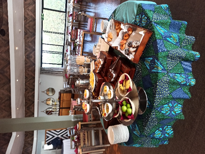 A buffet table displays assorted breakfast items. Doughnuts, pastries, and cereals are arranged in containers. A tiered stand holds small bowls of yogurt and fruit. Plates are stacked at the edge of the table. A colorful, patterned tablecloth covers the buffet table. Chairs and tables extend into the background, alongside a large window with a view of greenery.