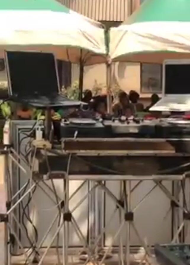 DJ setup with two laptops, a mixing console, and other equipment on a metal stand outdoors. Two green and white tents stand behind the setup, partially obscuring a group of people sitting and standing in the background. A tree branch is visible in the upper left corner of the frame. The ground appears to be paved with rectangular bricks.