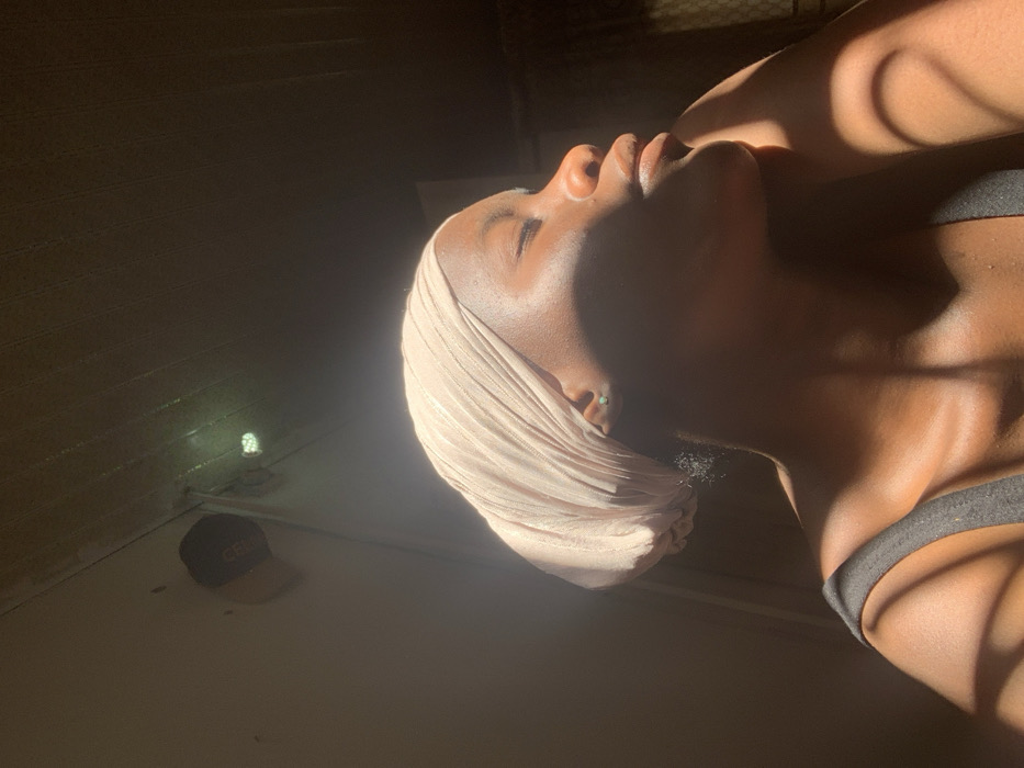 The image depicts an indoor scene in Rido, Nigeria, featuring an individual with dark skin. The subject, appearing female, is positioned in profile, facing right with eyes closed or downcast, illuminated by strong, direct sunlight. They wear a light-beige pleated head covering and a dark tank top. A small, light blue-green stud earring is visible in the left ear. The right hand appears to be supporting the chin or cheek area. Distinct linear shadows fall across the subject's face, neck, shoulder, and the background wall, indicating light filtering through an obstruction. The immediate room environment is largely in deep shadow. The ceiling appears to be made of dark, possibly corrugated or paneled material, reflecting a subtle light source. A dark object, consistent with a cap, is visible on the shadowed left wall, which also exhibits minor surface irregularities.