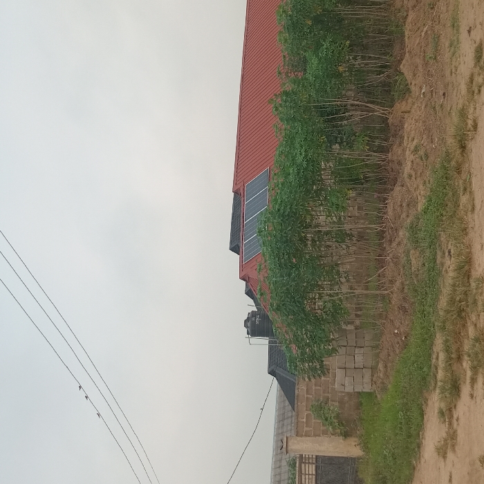 A low-angle outdoor shot depicts a building with a red metal roof, adorned with solar panels. Adjacent to the building, a row of cassava plants stands. Concrete blocks and a dark-colored water tank can also be seen near the building. Overcast skies dominate the background. Electrical wires with birds are on the left. A dirt path and scattered green vegetation lie on the right side.