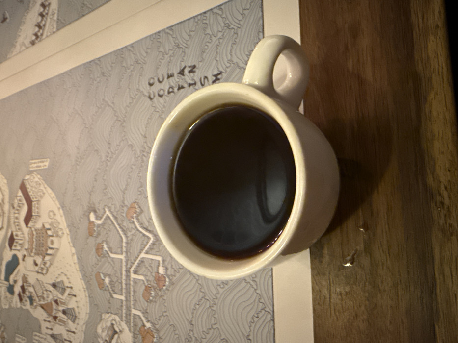 An off-white ceramic mug, containing dark liquid consistent with black coffee, is positioned on a dark brown wooden surface
