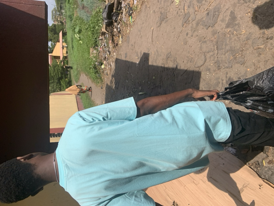 This image depicts an outdoor scene in Ijanikin, Nigeria, characterized by bright daylight and distinct shadows. In the immediate foreground and left, the back of a dark-skinned male is visible. He wears a light blue short-sleeved t-shirt, dark trousers, and a thin silver-colored chain around his neck. His left hand holds a crinkled black plastic bag. He is positioned under a dark brown, flat overhead structure which casts a large shadow to his right. To his left, a light-colored wooden panel or wall is visible. An unpaved, uneven dirt path stretches into the midground and background, showing indentations and variations in its surface. Approximately 20 meters down this path, a second individual walks away from the camera, identifiable by patterned clothing and a light-colored, possibly tan, head covering that obscures their head and shoulders. Further in the distance along the path, a third, smaller dark figure is discernible. To the left of the path, a yellow building with a dark brown roof edge is present. The area to the right of the path is characterized by dense green vegetation and unmanaged grass, heavily interspersed with a significant accumulation of scattered refuse and litter, including plastic bags and various debris. Beyond this vegetated and littered area, in the far background, another yellow building with a brown roofline is visible under a clear, bright sky.