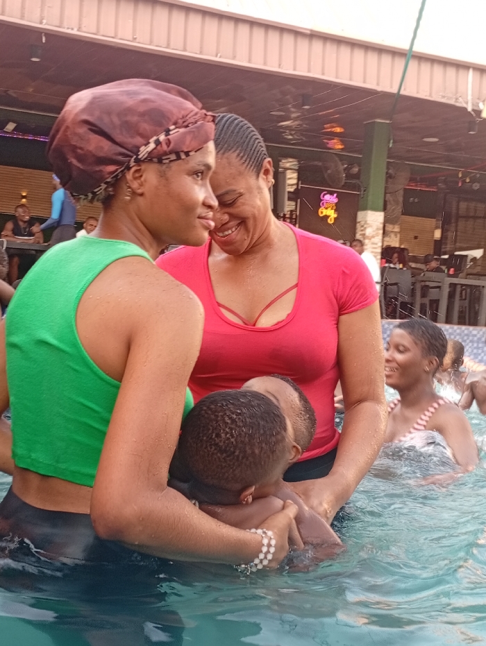 In a swimming pool, two women and a child are gathered. One woman is wearing a green tank top and a patterned headscarf, while the other woman is wearing a red shirt with a criss-cross detail in the front. The child is being held between the two women and appears to be submerged in the water. Other people can be seen swimming in the background. The pool is located near a building, possibly a restaurant or club.