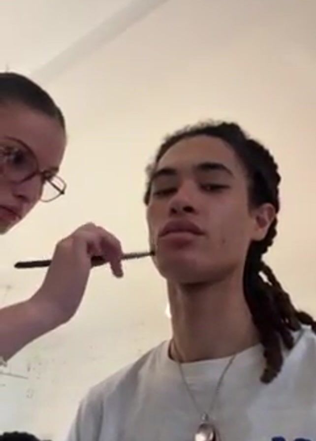 - "A fair-skinned young woman with glasses is applying makeup to the face of a young man with dark hair in dreadlocks" by FM-52BZY2, licensed under CC BY 4.0