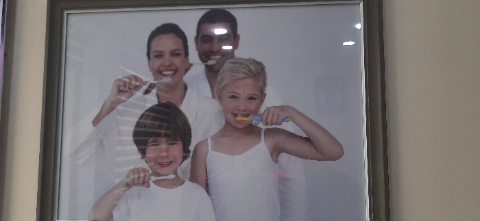 The image displays a silver-framed picture hanging on a light beige wall in Kogon City, Uzbekistan. The photograph within the frame depicts a smiling family of four: an adult woman, an adult man, a young girl, and a young boy. All four individuals are holding toothbrushes near their mouths, simulating the action of brushing. The adult woman and man are positioned in the background, both wearing white attire resembling bathrobes or medical coats. The woman holds a light blue/green toothbrush in her right hand. The man, positioned slightly behind her, holds a yellow toothbrush in his left hand. In the foreground, the young girl wears a white tank top and holds a blue and yellow toothbrush in her right hand. The young boy, positioned to the left of the girl, wears a white t-shirt and holds a light blue/green toothbrush in his right hand. The background of the photo itself is a plain light grey or white. Significant reflections are present on the glass surface of the framed picture, including horizontal lines consistent with window blinds and several bright white light sources, particularly prominent on the man's forehead and the upper right corner of the frame. A faint purple reflection is visible along the left vertical edge of the framed picture.