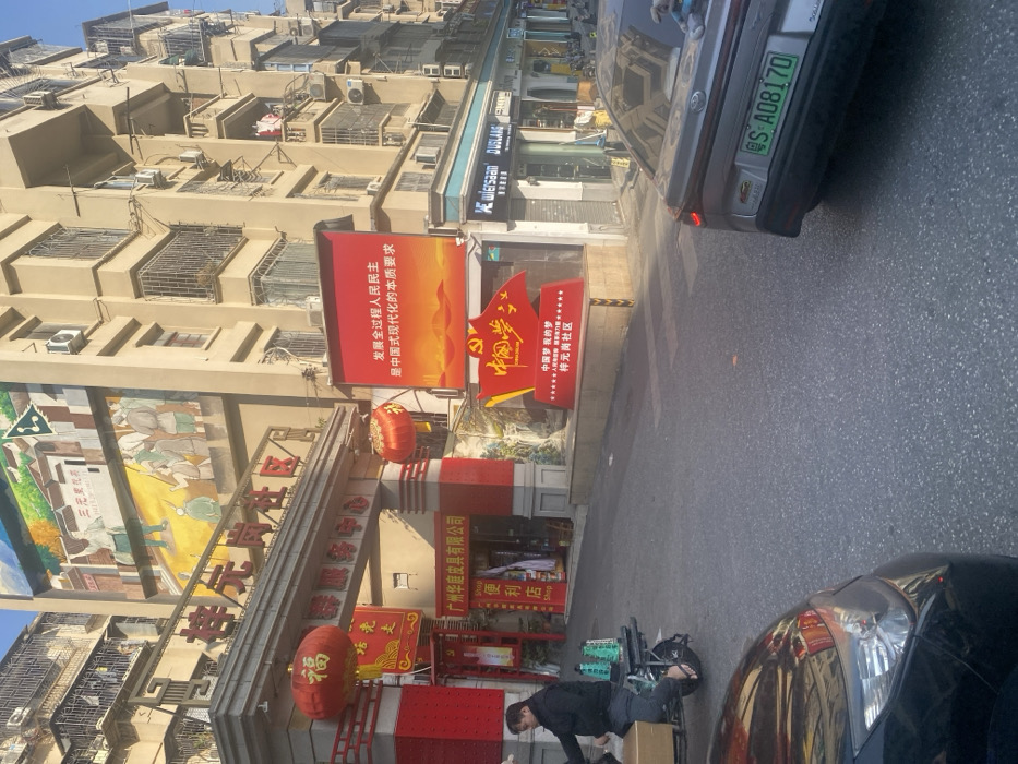 A street scene shows a pedestrian using a bicycle to move boxes next to a business called "Guangzhou Hua Ting Leather Goods Co. Ltd." Above the business are several hanging red lanterns. A banner proclaims, "Develop the whole process of people's democracy is the essential requirement of Chinese-style modernization." Another sign displays the Chinese communist party symbol and reads "Chinese dream, my dream, Shi Yuan Gang Community." Cars park on the street, with license plate S A08170 visible. The building above has many balconies.