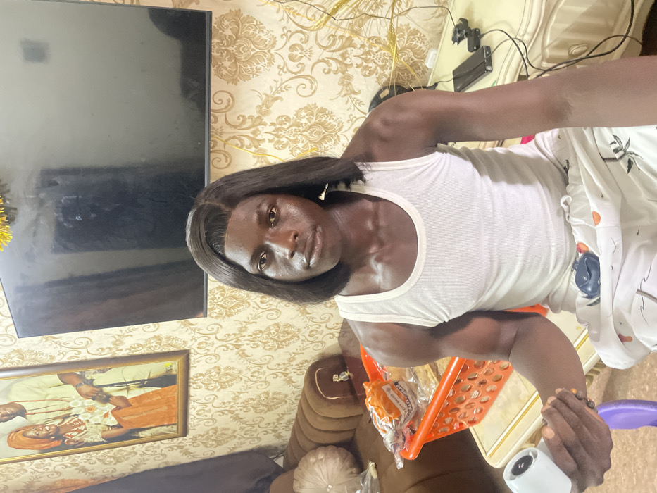 An individual is depicted seated indoors in a domestic setting within Awka, Nigeria. The subject is a dark-skinned person wearing a short, dark, bob-style wig with a visible lace frontal, a white ribbed tank top, and light-colored patterned bottoms. They hold a white cylindrical object, resembling a portable camera or speaker, in their right hand, facing the viewer with a neutral expression. The background features wallpaper with a gold and beige damask pattern. To the left, a brown upholstered sofa is partially visible next to a white table holding an orange plastic basket containing packaged goods. Above the sofa, a framed portrait of an older Nigerian couple in traditional attire hangs on the wall. A black flat-screen television is mounted on the wall behind the subject, partially obscured by a yellow decorative garland. To the right, another white table displays electronic devices, including a power bank.