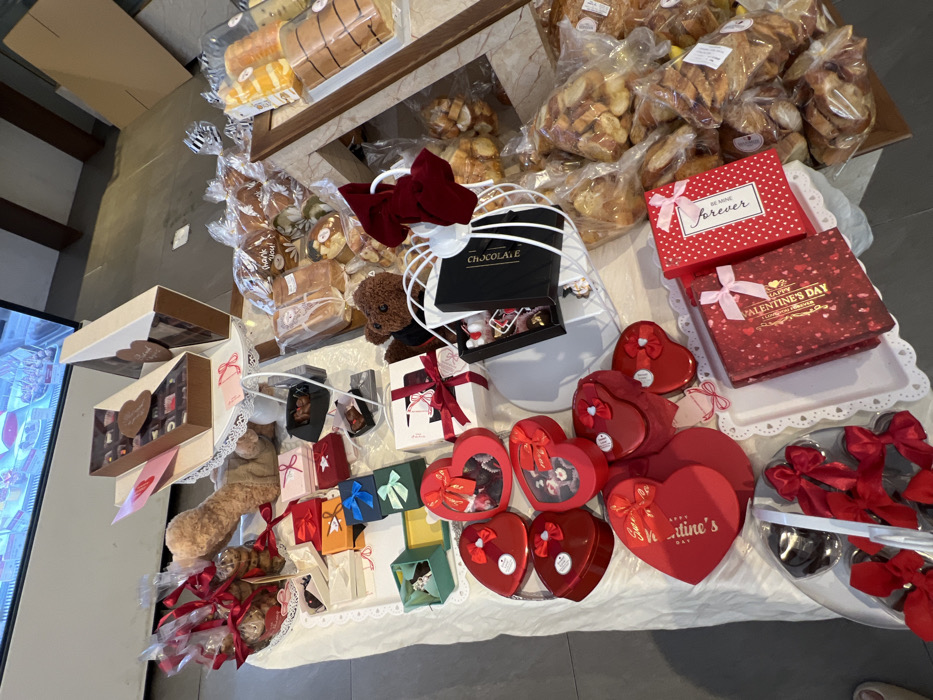 This image depicts a retail display of confectionery and baked goods in a store within Ho Chi Minh City, Vietnam. The scene is dominated by a white-draped table and an adjacent wooden display counter, both laden with various products, many themed for Valentine's Day. **Essential Details:** * **Objects on the white-draped table:** * Multiple red heart-shaped boxes, some with clear lids displaying chocolates, others solid with "Valentine's Day" text and red bows. * Several small, rectangular gift boxes in assorted colors (red, blue, green, yellow, pink), tied with ribbons. * Larger, rectangular boxes containing chocolates, some open to reveal individual pieces, often with brown and pink accents. One box has a heart-shaped chocolate. * Small clear plastic bags filled with cookies, tied with red ribbons, displayed in a tiered stand. * A large light-brown teddy bear is partially visible on the table. * A black "CHOCOLATE" box is placed within a white wire display basket, containing smaller items. * Two prominent red gift boxes, one labeled "Valentine's Day" and the other "Forever," both with pink bows, rest on a white scalloped tray. * A silver-colored tiered tray in the bottom left holds what appear to be dark chocolates or truffles, adorned with red bows. * **Objects on the adjacent wooden display counter:** * Numerous plastic-wrapped baked goods, including loaves of bread, bread rolls, and various pastries. * Several items feature "thank you!" stickers. * Long, cylindrical cakes or bread loaves are stacked in clear packaging on the right side. * A small brown teddy bear is visible near the transition between the two display surfaces. * **Environment:** * The background shows a light-colored wall with a partially visible display case containing more items, possibly cakes or pastries. * The floor is a dark gray, possibly concrete or tiled. * No people are visible in the scene. * The lighting is artificial, illuminating the products brightly.