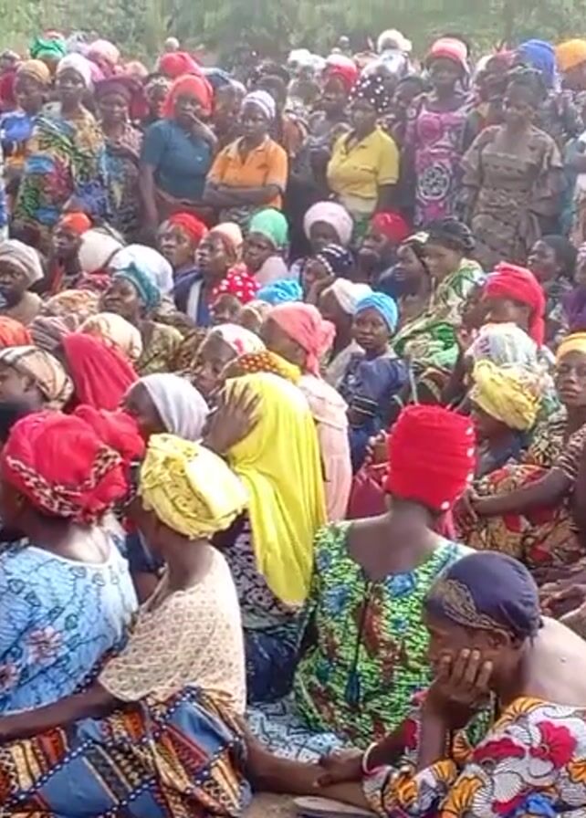 A large crowd of people, mostly women, are gathered outdoors, seated on the ground