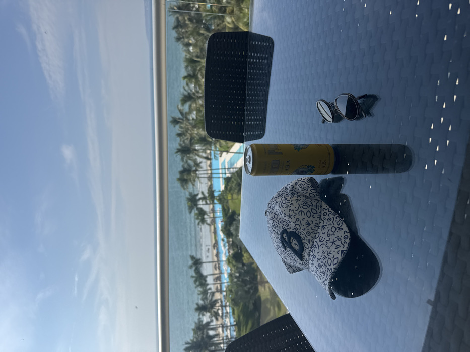 A table on a balcony overlooks an ocean view with palm trees. A chair, a can of hard seltzer, sunglasses, and a baseball cap are on the table. The sky is blue with some clouds.