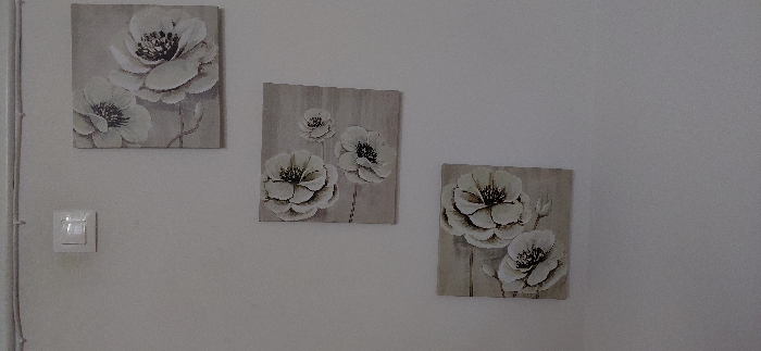 The scene captures a section of a light-colored interior wall, likely off-white or light grey. Three square art pieces are mounted on the wall in a staggered, diagonal arrangement. Each piece features stylized, monochrome floral motifs predominantly in white and grey tones with dark centers, set against a light brown or beige textured background. The top-left art piece displays two large flowers. The middle art piece, positioned to the right and slightly lower, depicts four flowers of varying sizes. The bottom-right art piece shows three flowers. A white, rectangular light switch with a single rocker is affixed to the wall, positioned below and to the left of the top-left art piece. A white, vertically oriented conduit or cable runs along the far-left edge of the frame, partially visible. No individuals, actions, or interactions are present. The specific location within Ilion, Greece, cannot be determined from the visual information provided.