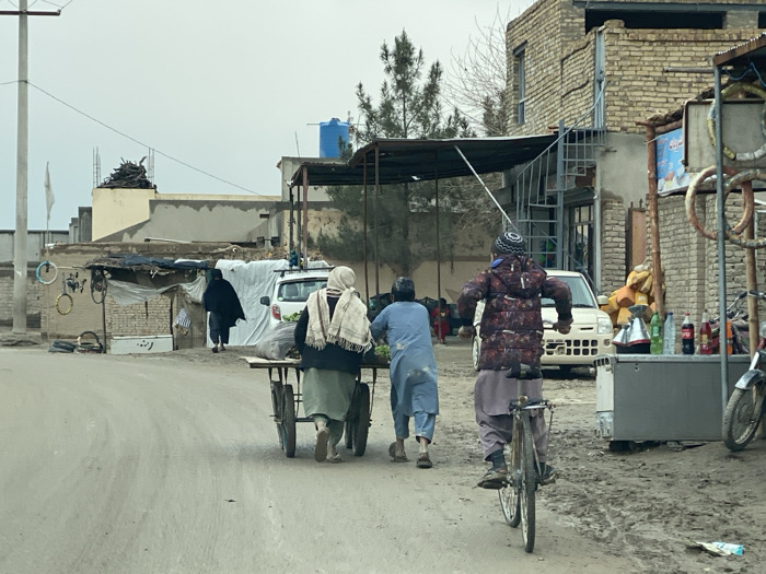 This image depicts an unpaved street scene in Nakhonay, Afghanistan, under an overcast sky. In the foreground, three individuals move away from the viewer. On the left, a person wearing a light green skirt/trousers and a white headscarf, and another person in light blue attire, are pushing a two-wheeled handcart loaded with dark bags and green leafy produce. To their right, a younger individual in a patterned padded jacket, brown trousers, and a beanie hat rides a dark-colored bicycle. On the immediate right, a makeshift street vendor stall features a grey metal surface holding two kettles (one silver, one black), several plastic bottles (green, clear, dark), and branded soda bottles (Coca-Cola, Fanta). Behind this stall, yellow sacks are stacked, and a motorcycle is partially visible on the far right. The midground and background consist of various structures. On the left, a utility pole stands near a low-rise building with exposed rebar, adjacent to a crude shelter constructed from various materials, including corrugated metal and tarpaulin. A person fully covered in a dark garment walks away from the viewer near this shelter, and a white vehicle (possibly an SUV or van) is parked, partially obscured. A blue tarp covers objects on the vehicle's roof. Further left, a white flag is visible on a pole in the distance. On the right side of the street, a multi-story brick building shows signs of wear and construction, featuring an external metal spiral staircase. Behind the buildings, bare trees are visible, and an elevated blue cylindrical water tank is situated above the rooftops. The ground is unpaved, displaying dirt and potential muddy tracks.