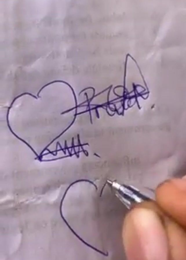 A hand uses a pen to draw a heart shape on a white piece of paper that also has other drawings on it, including another heart and a signature