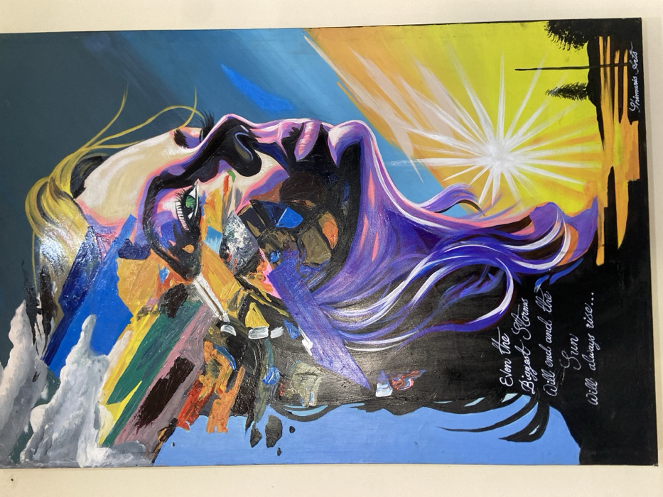 An abstract painting features a figure with an upturned face, suggesting hope or resilience