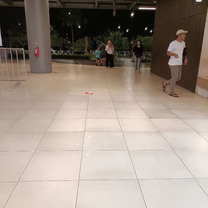 light grey tiled floor with white grout lines. The floor is in a building. There is a fire extinguisher on the left side of the image, and three people are visible in the background walking in a line toward the right of the image. The individual in the lead is a man wearing a light brown t-shirt, khaki pants, and a white baseball cap. The man is holding a black object in his right hand, and is walking in a slightly crouched position with his head looking down. The man is walking towards the right side of the image. Behind him are two women. One woman is wearing a black hijab and a dark skirt. The other woman is wearing a short-sleeved, light-blue dress. The woman with the dress is walking ahead of the woman with the hijab. The woman with the hijab is walking in front of the man. The three individuals appear to be in a hallway, with a wall on the right side of the image. The hallway has an arched ceiling. The image was taken at (latitude: -7.045, longitude: 110.324) in Kecamatan Mijen, Indonesia.
