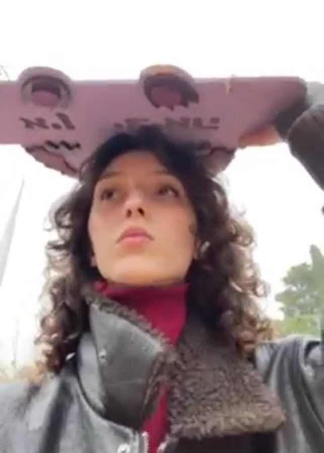 young woman holding a pink skateboard over her head. She has dark curly hair and is wearing a black leather jacket, a brown fuzzy scarf, and a red turtleneck. She is looking up towards the camera, her face appearing serious. The background shows trees and a white sky, suggesting she is outdoors, possibly in a park or natural area. The skateboard has the words "N. 1" written on it.