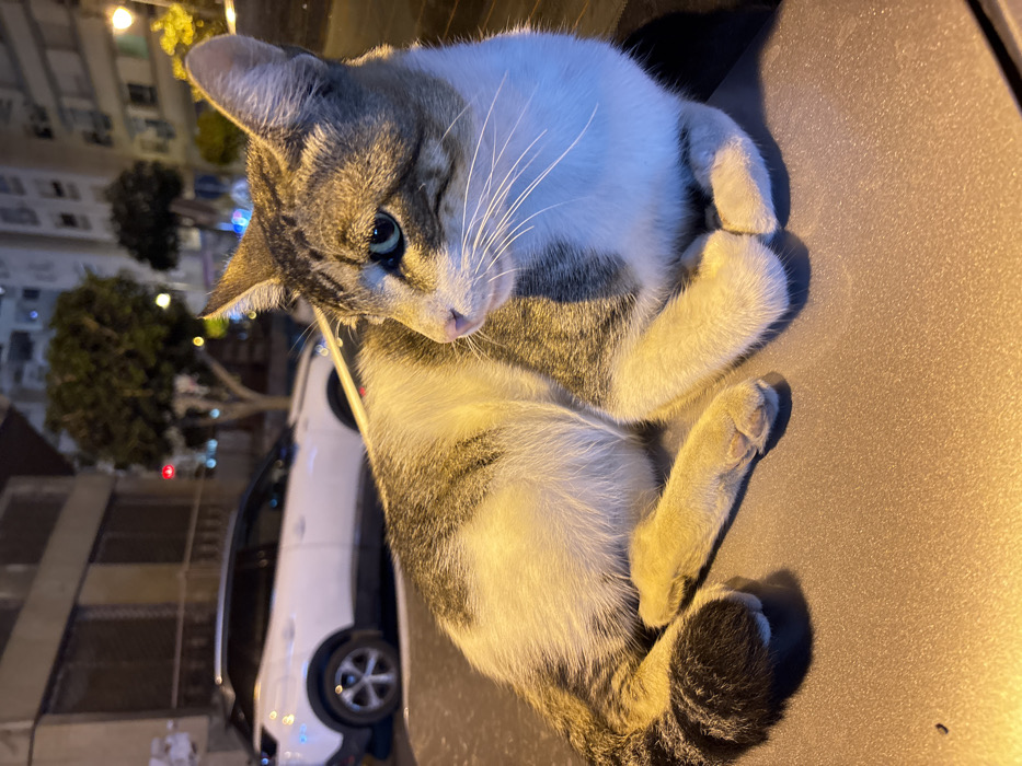 - "A domestic short-haired cat, displaying a tabby (grey-brown striped) and white coat pattern, is observed at night" by FM-YEyMx1, licensed under CC BY 4.0
