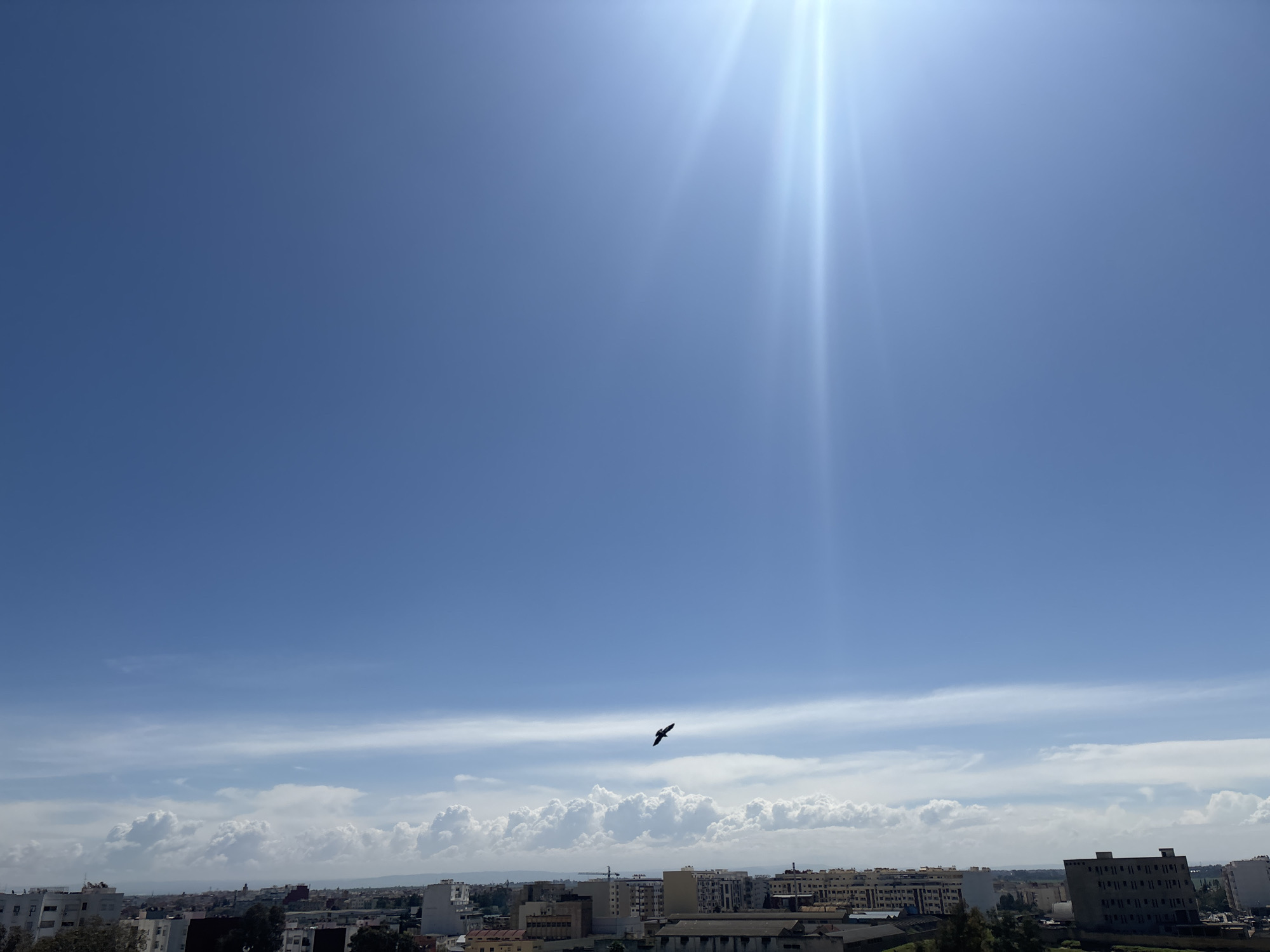 The image presents a daytime, elevated perspective over the city of Meknes, Morocco. The upper two-thirds of the frame is dominated by a bright blue sky. Intense sunlight from the upper right quadrant produces distinct vertical lens flare streaks. A narrow band of high-altitude clouds extends horizontally across the mid-sky, with scattered white cumulus clouds clustered along the lower horizon line. A single dark bird is visible in mid-flight against the sky, positioned in the lower central area with its wings extended. The lower third of the image reveals a dense urban landscape characterized by numerous multi-story buildings, predominantly residential and commercial structures of various heights and designs, with flat roofs. Building colors range from light off-white to darker tones. Sparse green foliage is visible among the buildings. In the distance, a hazy line of mountains or hills is present on the horizon, and a large, light-colored industrial-type building stands out in the mid-ground to the right. A faint construction crane is discernible in the distant left mid-ground.
