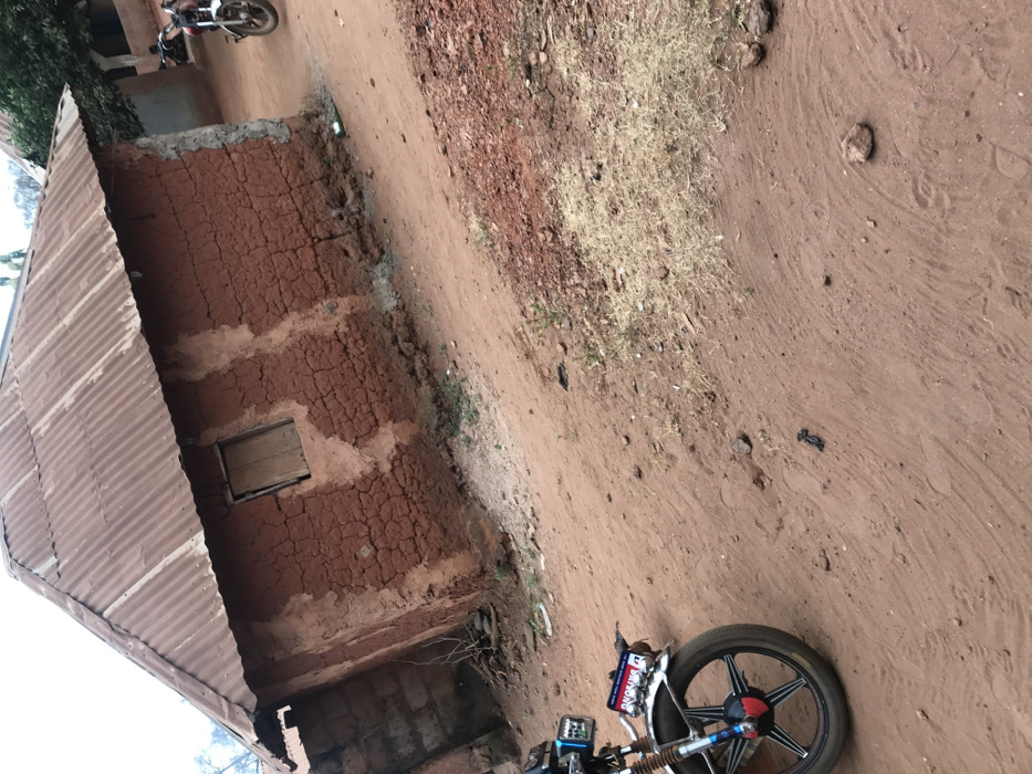 The scene in Ogodo, Nigeria, displays an unpaved, reddish-brown dirt surface occupying the foreground and midground, marked with tire tracks and scattered small rocks and dry vegetation. A single-story structure constructed of reddish-brown, cracked mud or packed earth walls with an uneven texture dominates the midground. It features a weathered, corrugated metal roof. On the visible facade, a single rectangular window with closed wooden shutters is present. An incomplete concrete block wall section abuts the left side of this building. In the foreground on the left, the front wheel and partial body of a black motorcycle are visible. It has a chrome front fender, a black tire with a multi-spoke silver rim, and a red circular accent on the hub. A blue rectangular plate with white lettering, partially reading "ONOKING," is attached to the front. In the background on the right, a second motorcycle, appearing white or silver, is partially visible, parked or in motion near a lighter-colored building partially obscured by green foliage. A faint human figure is discernible near this background motorcycle, but specific details are not resolvable.
