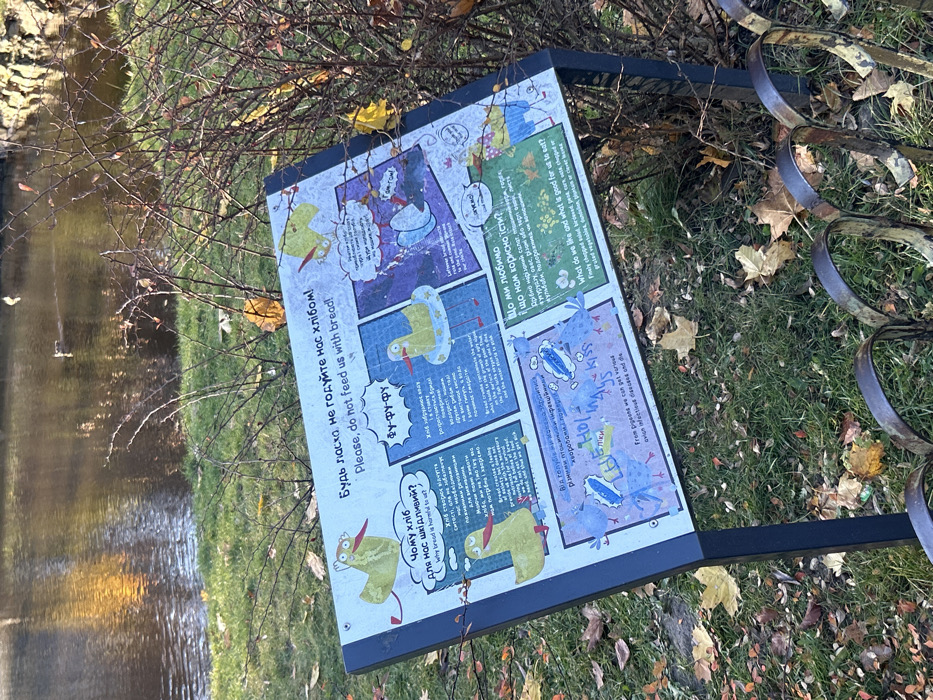 The image depicts an outdoor park scene in Lviv, Ukraine, adjacent to a body of water