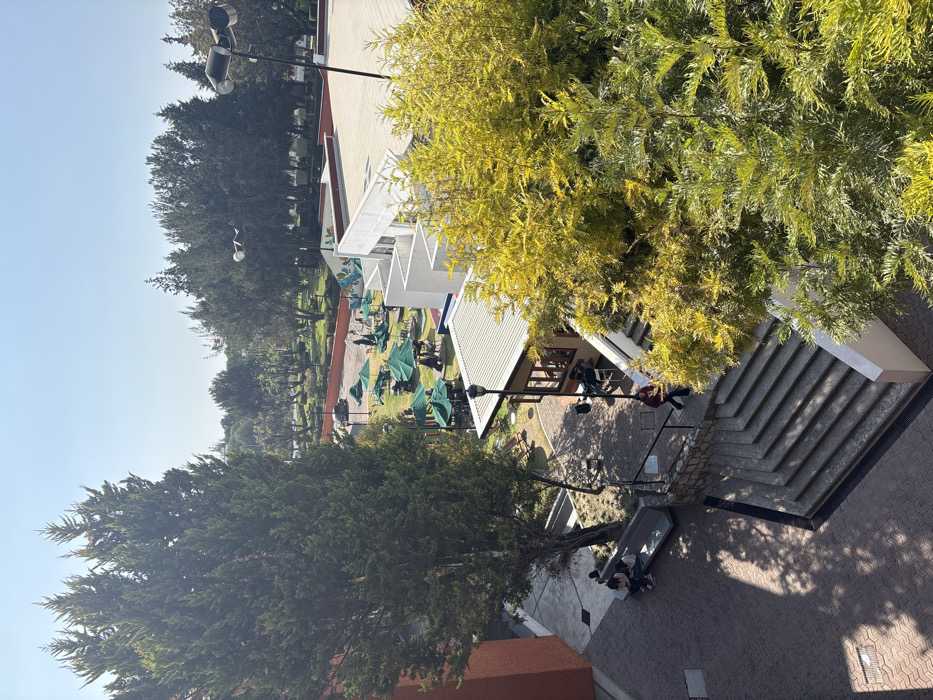 An elevated perspective shows a verdant campus scene. Lush trees frame the image, with an expanse of green umbrellas dotting the lawn. Several white buildings with angled roofs are visible. A set of concrete stairs descends, revealing a paved area where people sit on benches. Light posts add to the ambiance, casting shadows on the ground.