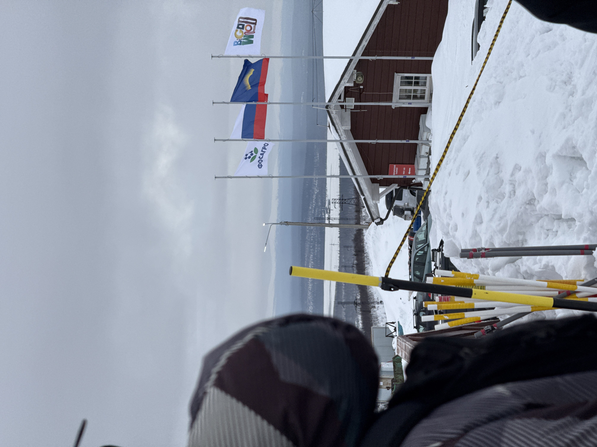 The image captures a winter landscape on a snow-covered slope in Kirovsk, Murmansk Oblast, Russia, under an overcast sky. In the immediate foreground, the upper left quadrant shows the blurred partial view of a person's head and shoulder, wearing a grey, black, and white plaid hat and a dark jacket. A collection of ski or marker poles, predominantly yellow, white, and black, with some featuring yellow striped tape, are vertically embedded in the snow. A black and yellow striped rope or barrier line stretches horizontally across the snow in the mid-foreground. The midground features a one-story reddish-brown wooden building with a snow-covered gable roof and a white-framed window. Four flagpoles are erected in front of the building. From left to right, the flags displayed are: a white flag with the green 'ФОСАГРО' (FosAgro) logo, the national flag of Russia, the flag of Murmansk Oblast (blue with a yellow reindeer horn symbol), and a white flag with a colorful 'BCN WO!' logo. A red sign on the building's facade is visible, bearing the text "МЕДИЦИНСКИЙ КАБИНЕТ" (Medical Office) and "FIRST AID" with a left-pointing arrow. A light-colored SUV with a roof rack is partially obscured by snow, parked near the building. Utility poles and power lines traverse the scene. The background displays a vast, frozen body of water, likely Lake Imandra, with snow-covered banks, bordered by dense coniferous forest. Distant snow-capped mountains are visible beneath the uniformly grey sky. A single street light on a tall pole is illuminated.
