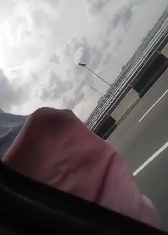 view from inside a moving car, possibly in the back seat, looking out the window. The camera is at an angle. Outside, the car is driving on a bridge with multiple lanes and a concrete barrier. There are streetlights along the side of the road. In the distance, a cityscape is visible under a cloudy sky. Other cars can be seen in the neighboring lanes. A pink shirt or blanket is visible in the foreground.