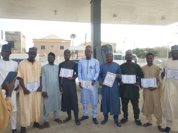 Nine adult males are arranged in a horizontal line, facing the camera, under a white, open-air canopy structure in Kabuga, Nigeria. Each male is dressed in traditional Nigerian attire, consisting of long tunics and caps; garment colors include white, beige, light blue, dark blue, olive green, and black. All nine individuals are holding a white, framed certificate with dark borders at waist height, presenting them towards the foreground. Their facial expressions are generally neutral or exhibit faint smiles. In the lower left foreground, a hand holding a dark smartphone is partially visible. The background features multi-story buildings, including a prominent beige structure with multiple windows and a darker, unfinished concrete building. Partially visible vehicles, specifically a white van or bus, and streetlights are present further in the background under a bright sky.