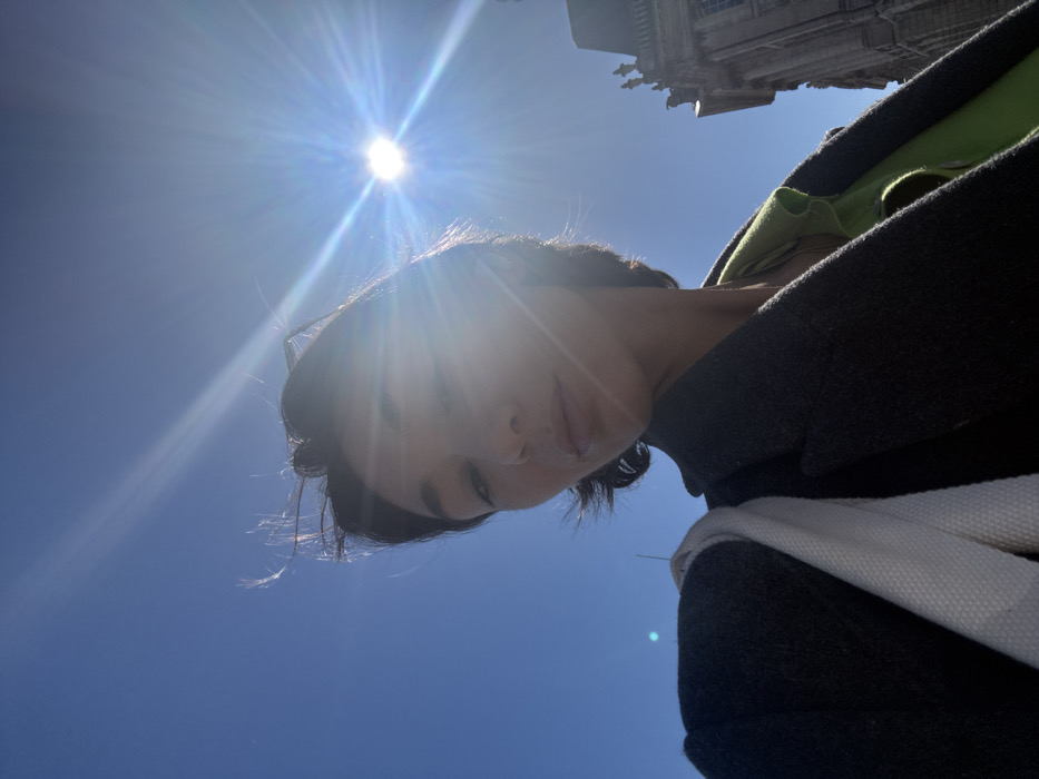 A portrait-oriented outdoor photograph features a woman's upper body and face against a clear blue sky. The sun is intensely bright in the upper right, generating significant lens flare that partially obscures the woman's face. She has short, dark, windswept hair and wears a dark grey coat over a lime green garment, with a white strap visible over her left shoulder. Her expression is neutral, and she looks directly towards the camera. In the extreme upper right background, a section of an ornate, dark stone building with classical architectural details and small statues along its roofline is discernible. This architectural style corresponds to the Palais de la Bourse, situated in the Place de la Bourse in Bordeaux, France. The environment is under strong natural daylight.