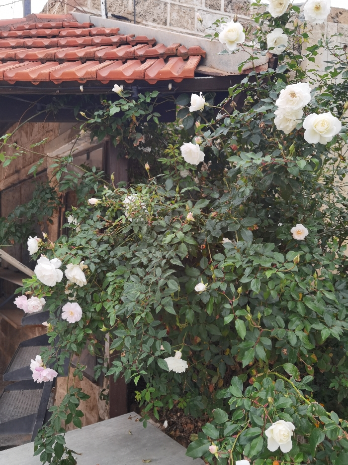 The image displays an outdoor scene featuring a prominent climbing rose bush in bloom. Numerous white and light pink roses, along with various buds, are visible among dense dark green foliage that covers much of the frame. In the upper left quadrant, a terracotta tiled roof overhang with curved, reddish-orange tiles is present, supported by a light gray concrete fascia. Behind this roofline, a wall constructed from light-colored, rectangular stone blocks is partially visible. Beneath the roof overhang, dark wooden structural elements and a dark-framed opening, possibly a window or doorway, are partially obscured by the roses. To the lower left, a dark-colored, open-tread metal staircase ascends with several steps visible, its treads appearing textured. A light gray concrete or paved surface is present in the lower-center foreground. No individuals or animals are depicted. The specific location within Tel-Aviv, Israel, is not discernible from the visual evidence.