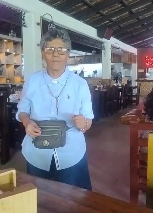 woman in glasses and a light blue shirt, wearing a fanny pack. She gestures with her hands as she talks. She stands in a restaurant with dark wooden tables and chairs, a visible kitchen area, and a sign in neon lights. The ceiling is made of dark wood.