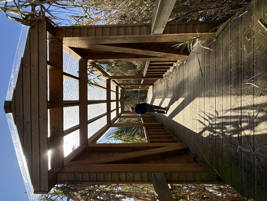 A single individual is observed walking away from the camera on a wooden boardwalk or elevated walkway within the city of Mira, Portugal. The walkway features a gabled wooden frame structure partially covered by translucent corrugated plastic or polycarbonate roofing panels, extending into the distance under a clear blue sky. The person, wearing dark clothing and a white baseball cap, is positioned approximately one-third of the way into the covered section, casting a long shadow on the wooden planks due to direct sunlight entering from the left. The boardwalk is constructed from horizontal wooden planks and has wooden railings on both sides. Tall, dense, dried reed-like vegetation flanks both sides of the walkway, extending above the railing level. Scattered dry plant debris is visible on the boardwalk surface. Sunlight penetrates the structure, creating patterns of light and shadow on the path, with a pronounced sun flare visible at the upper left of the image, illuminating parts of the wooden framework.