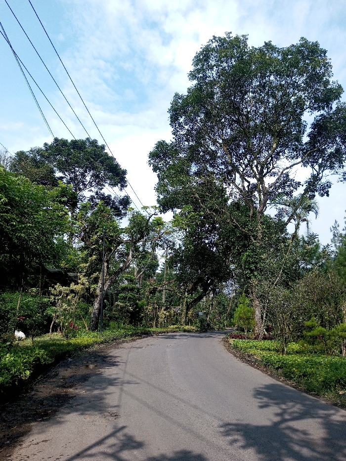 This image captures an unoccupied paved asphalt road curving gently to the right in Sandamal Eliya, Sri Lanka. The road is bordered by dense vegetation consisting of numerous mature broadleaf trees with dark green canopies and varied undergrowth including bushes and smaller plants. A prominent large tree stands on the right side of the road. Overhead, multiple dark utility wires extend across the upper left portion of the frame. A dark, slender pole is partially visible on the left amidst the foliage, and a white, obscured object is present further left within the greenery. The sky above is partly cloudy, featuring white cumulus clouds against a light blue backdrop. Strong daylight illuminates the scene, casting distinct tree shadows onto the road surface in the foreground. No individuals, animals, or observable actions are present.
