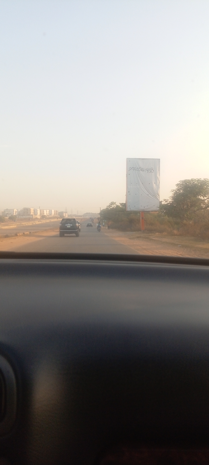 A view from inside a vehicle, focused on the dashboard and the road ahead. The road leads to distant buildings under a hazy sky. A black SUV is in the foreground, with a motorcycle and pedestrians further ahead. A large billboard stands to the side of the road, displaying a phone number. Trees and vegetation line the road, adding depth to the scene.