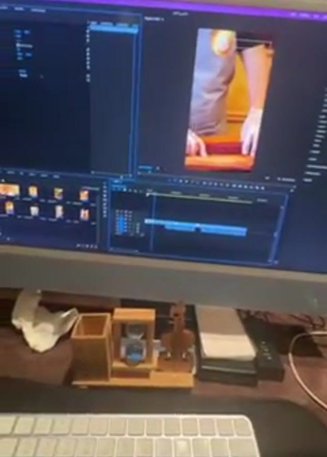 A computer screen shows a video being edited using Adobe Premiere Pro. The video on screen depicts a person wearing gloves preparing meat, likely for a culinary purpose. The computer sits on a desk with a white Apple keyboard, a mouse, and various desktop items including a pen holder, hourglass, and what appears to be a small wooden violin. The background features a textured wall or curtain.