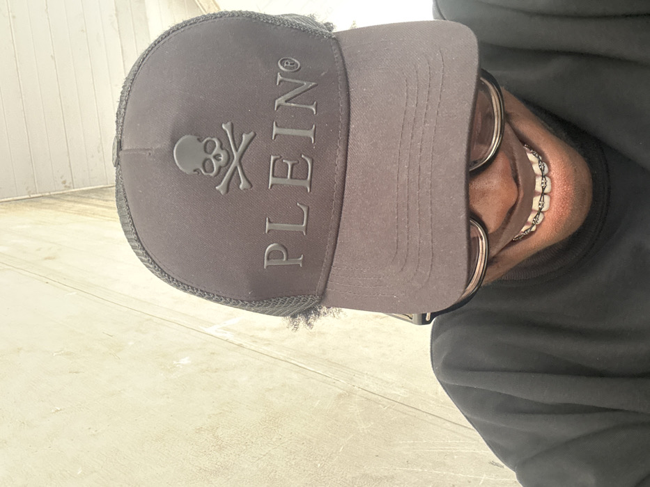 A close-up, low-angle portrait shows an individual, appearing to be of dark skin tone, from the chest up against a plain, light-colored wall. The individual wears a black long-sleeved garment and a black baseball cap with a mesh back. The front of the cap features a raised black skull and crossbones emblem above the raised black text "PLEIN®". They wear eyeglasses with clear lenses, partially obscured by the cap's brim, which casts a shadow over the upper face. The individual is smiling widely, revealing dental braces on both upper and lower teeth, and appears to be looking downwards. The background wall is nondescript, with subtle vertical lines, providing no specific visual indicators of a particular location within Ihiagwa, Nigeria.