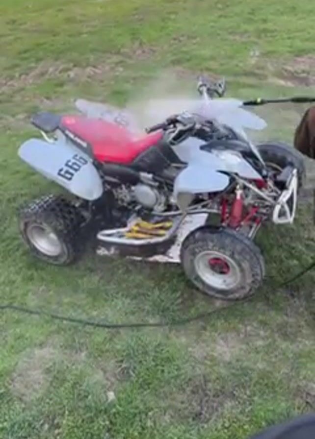 A man is pressure washing an ATV on a grassy surface. The ATV is white and gray with a red seat and the number "666" displayed on its side. The ATV appears muddy. A light gray car is parked in the background.