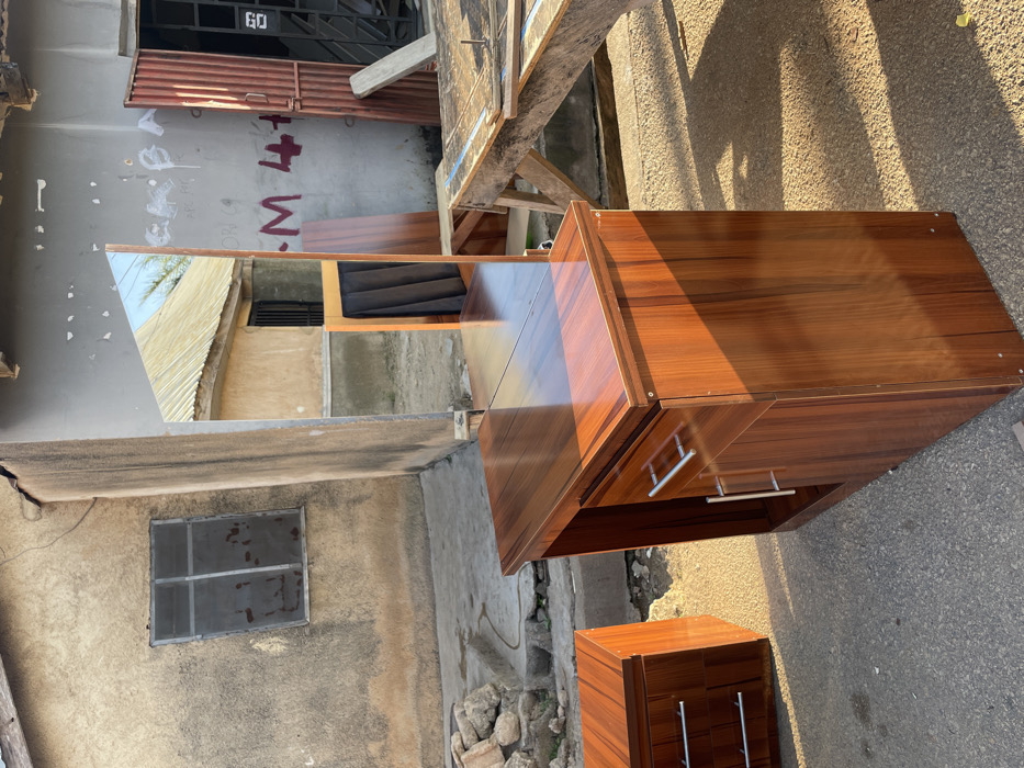 The image depicts an outdoor scene in an urban area of Jos, Nigeria. In the foreground, two pieces of new, reddish-brown laminated furniture are positioned on an asphalt surface. The central object is a dressing table featuring a large, rectangular mirror that reflects a portion of the environment behind it, specifically a building with a light-colored, possibly metal, gabled roof, a dark doorway, and a chair with a black padded backrest. The dressing table has a single drawer and a two-door cabinet below, all equipped with cylindrical silver handles. To its immediate left and slightly forward, a smaller, matching cabinet with two drawers and silver handles is visible. The background to the left of the furniture features a light brown, rough-textured stucco building wall with a rectangular window, which has a dark, opaque pane and a light-colored metal frame. Below the window, a concrete ledge transitions to an unpaved ground area scattered with light-colored rocks. The background to the right of the furniture, directly visible and partially reflected in the mirror, includes a grey-painted building wall displaying red graffiti, notably "M 4+" and other indistinct script. An open, reddish-brown corrugated metal door reveals a dark interior. To the right of the door, a rough wooden workbench, constructed from planks, holds additional wooden materials and exhibits blue markings. Strong, directional sunlight illuminates the scene, casting distinct shadows of the furniture and structures. No individuals are present.